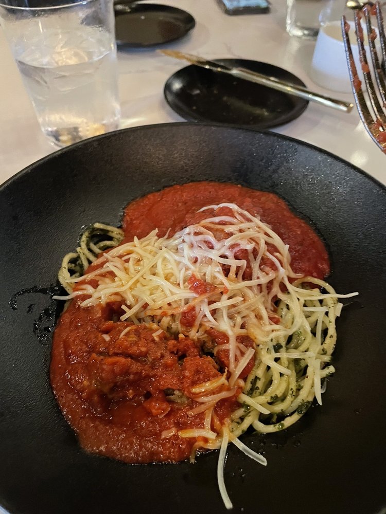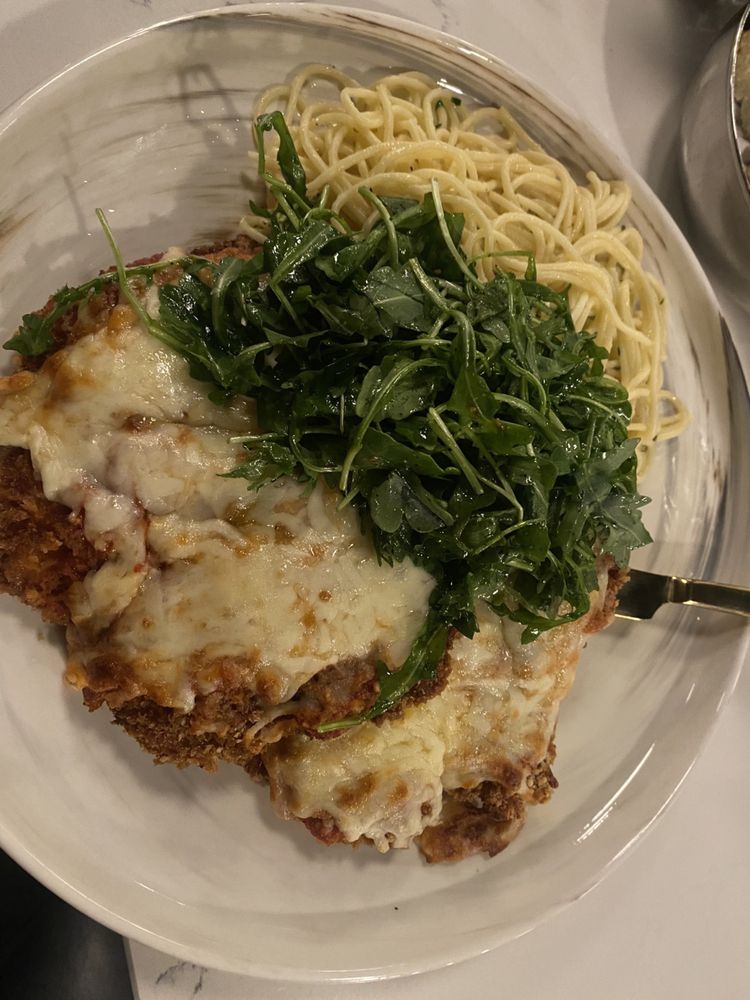 Spinach ravioli, chicken, asiago cream sauce, pinenuts and toasted garlic bread crumbs.