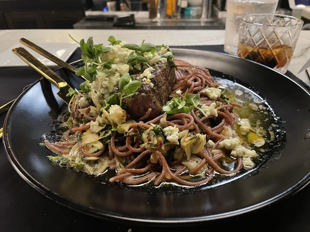 6 oz. chateau steak, iceberg wedge, bacon, tomatoes, red onions, capers, rosemary Gorgonzola dressing and balsamic drizzle.